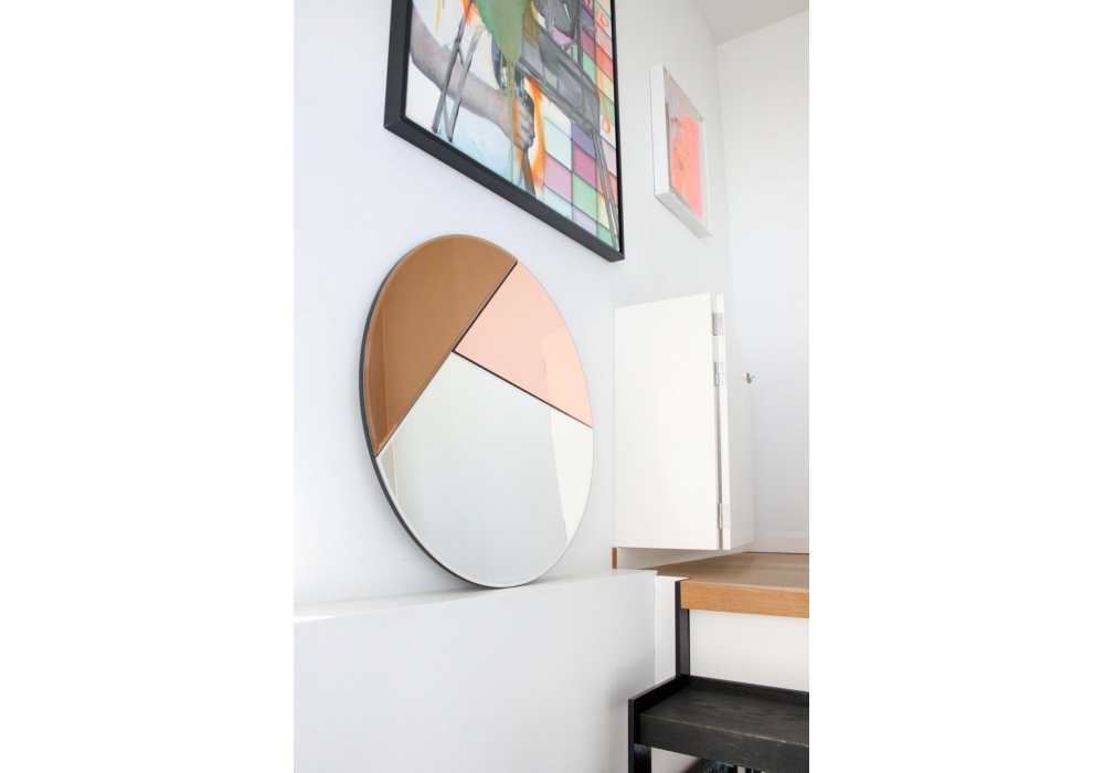 Nouveau 70 produced and designed by Reflections Copenhagen is a circular glass mirror applied on an MDF support base. The mirror features colorful geometric shapes in different finishes that refer to the 80s geo-style era.