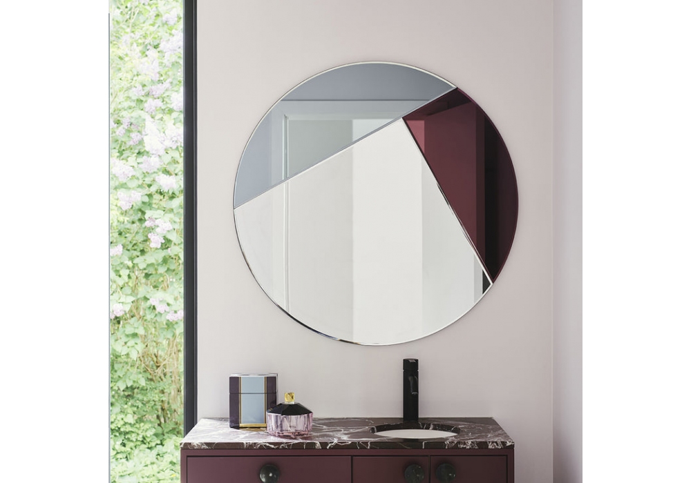 Nouveau 90 produced and designed by Reflections Copenhagen is a circular glass mirror applied on an MDF support base. The mirror features colorful geometric shapes in different finishes that refer to the 80s geo-style era.