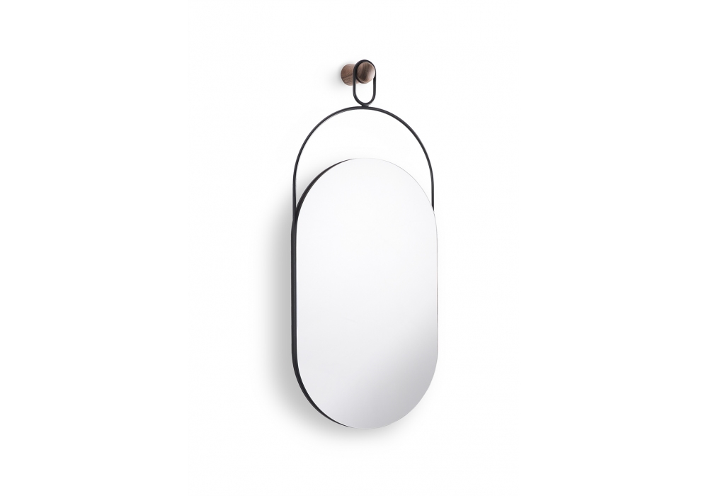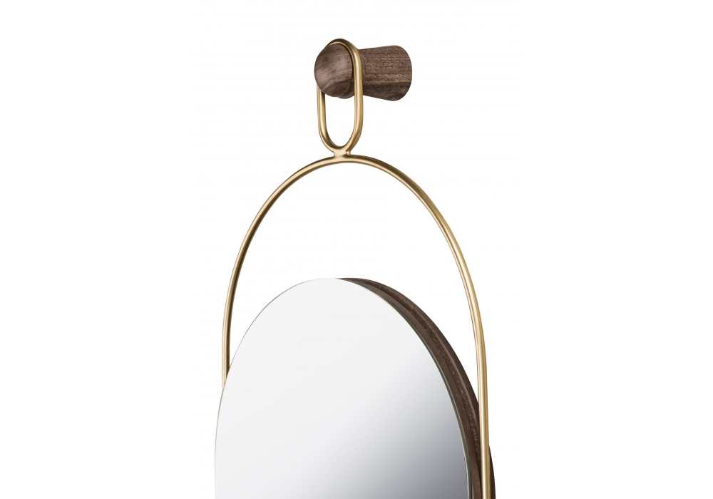 Espejo Eslabón designed by Andrés Martinez for Nomon is a wall mirror with walnut wood structure and gold or black colored brass ring.