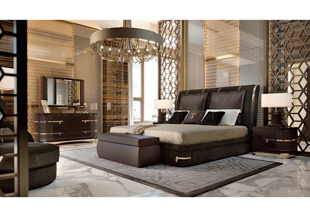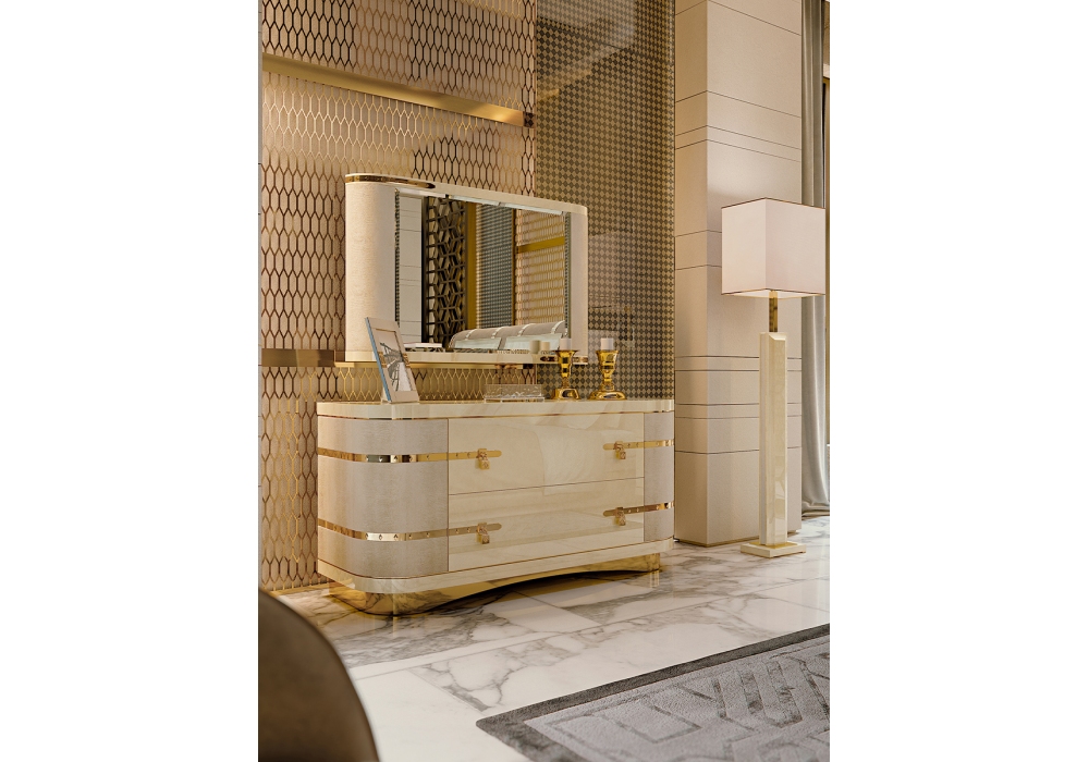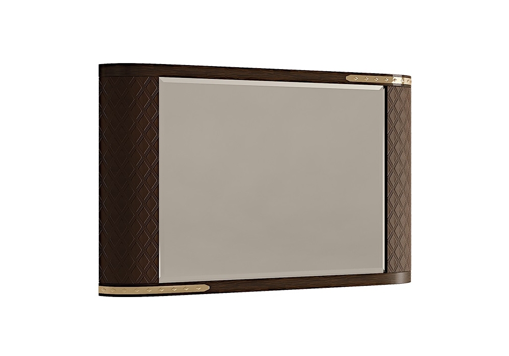 Diamond designed by Giovanni Cagnato for Turri is a mirror with structure in MDF and particle board panels in hand-decorated glossy polyester finish and leather upholstery. Metal parts in gold finish.