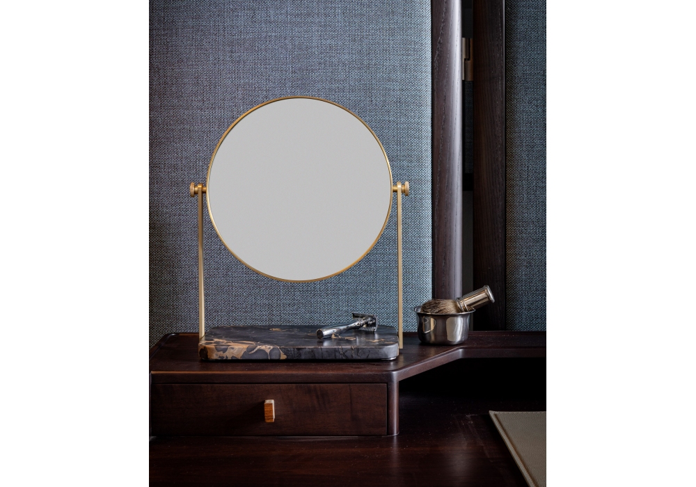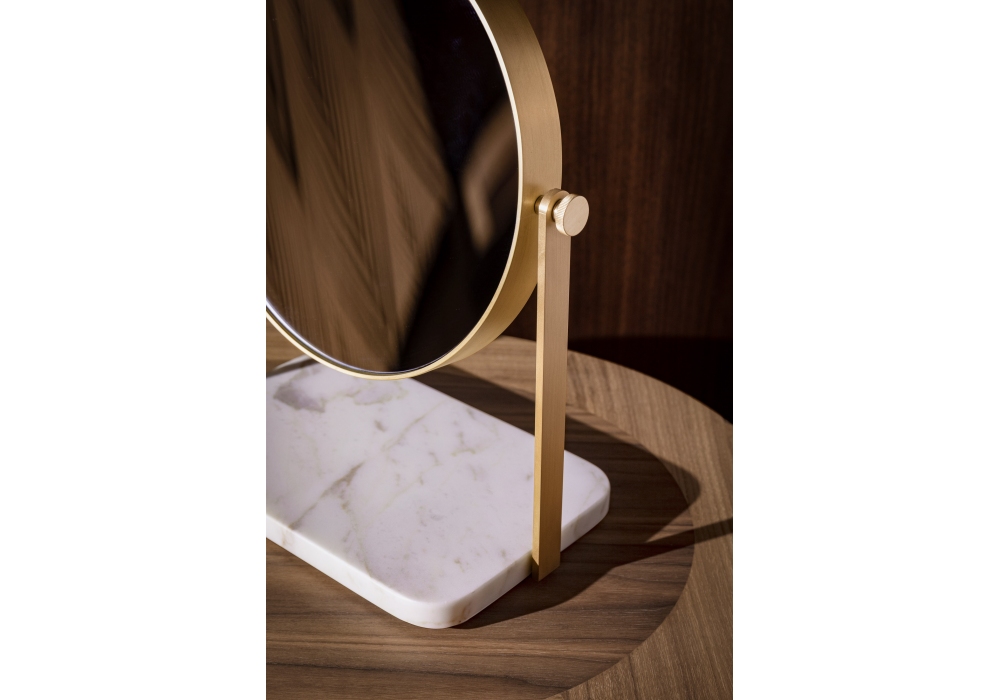 Regarde-moi designed by Giuseppe Casarosa for Ceccotti Collezioni is a swiveling table mirror with brass structure and marble base.