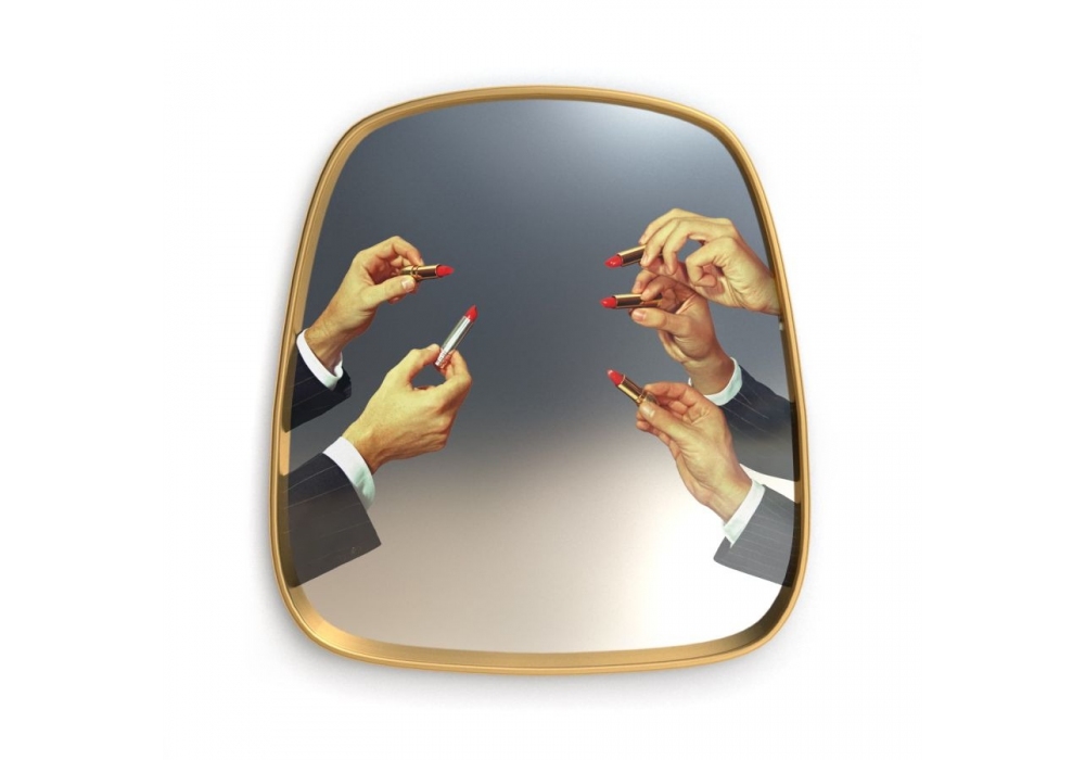 Lipsticks designed by Toiletpaper for Seletti is a rounded mirror with MDF frame hand-covered in brass leaf. The central mirrored part is made of glass with colored prints.