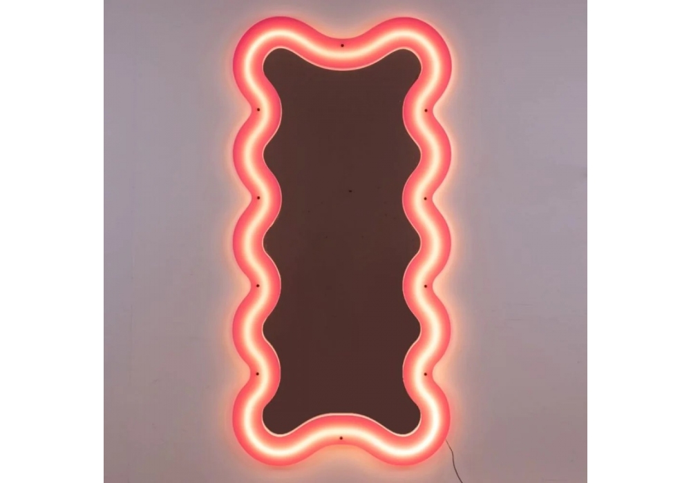Supercurve designed by BBMDS for Seletti is a mirror with pink Perfspex frame and glass mirror. The frame is backlit with LED light sources. Supercurve is available in different models.
