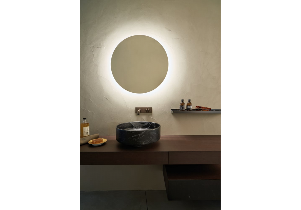 Bucatini designed by Fabio Bortolani & Ermanno Righi for Agape is a round mirror with a polished edge supported by a steel cable and covered with transparent plastic material or fixed to the wall. Available in the version with or without LED.