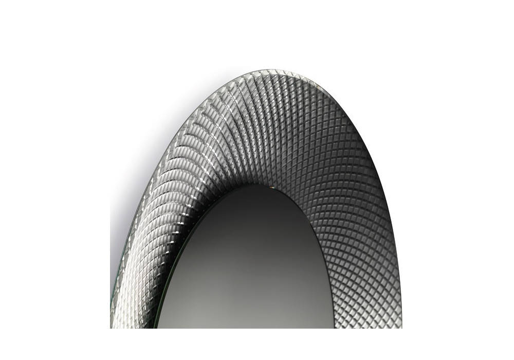 Venezia designed by Matteo Baroni for Reflex Angelo is a mirror in extra-clear glass with a 45° bevel. Curved extra-acid glass frame with engravings. LED lighting.