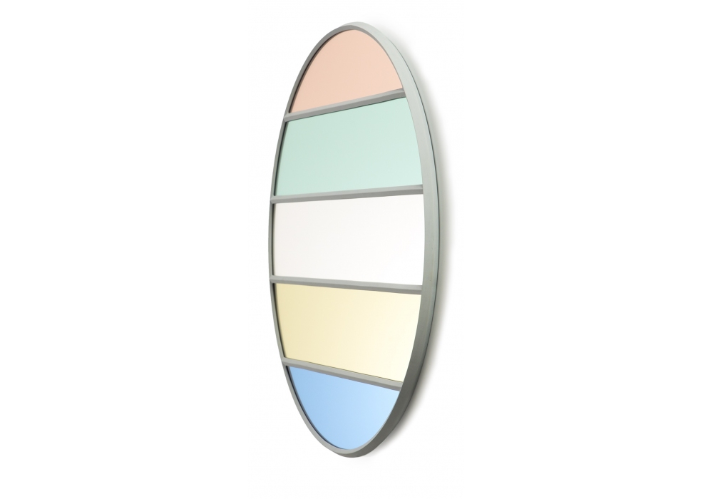 Vitrail designed by Inga Sempé for Magis is a round mirror with a rubber frame. Mirror with back-filmed glass and colored bands.