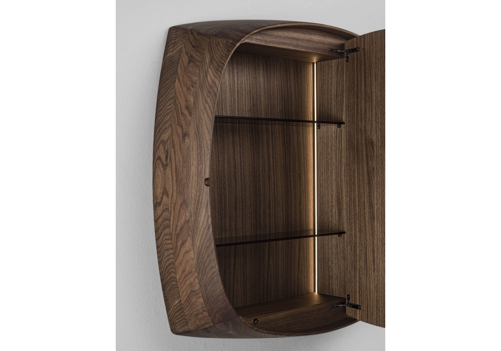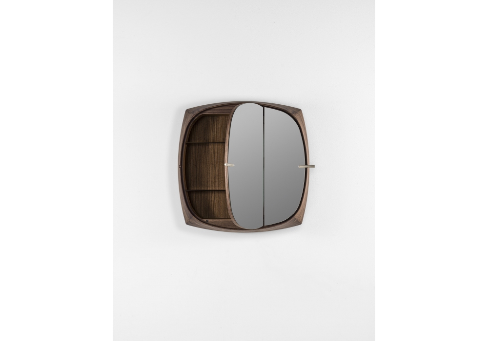 Vico 87 designed by D. Dolcini for Proada is a wall mirror cabinet featuring two asymmetric doors and a solid canaletta walnut frame. Inside there are smoked glass shelves. The handles are made of metal in a champagne finish and covered in sand Cuoietto. LED lighting with integrated opening sensor.