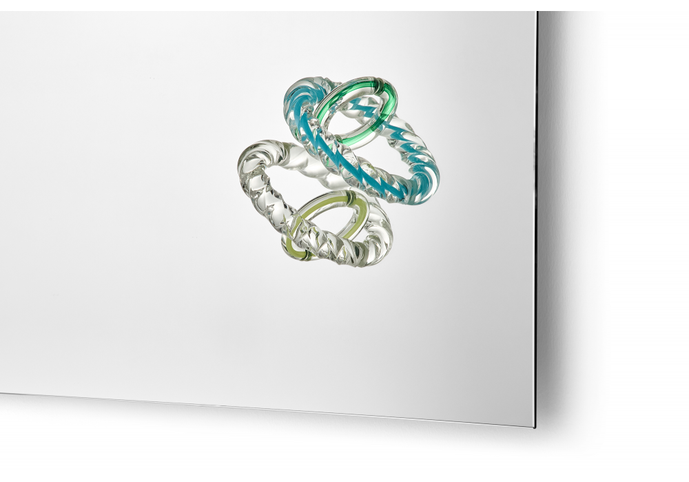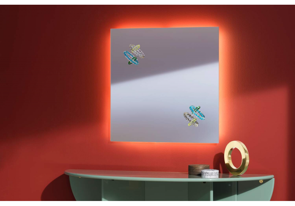 Hooptical designed by Bethan Laura Wood for Cassina is a backlit mirror with backlit glass decorations. Dimmable light.