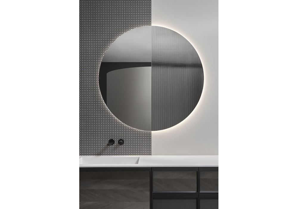Superluna designed by Gumdesign for Antonio Lupi is a polished edge mirror with a ribbed glass insert, white LED lighting, and a frame.