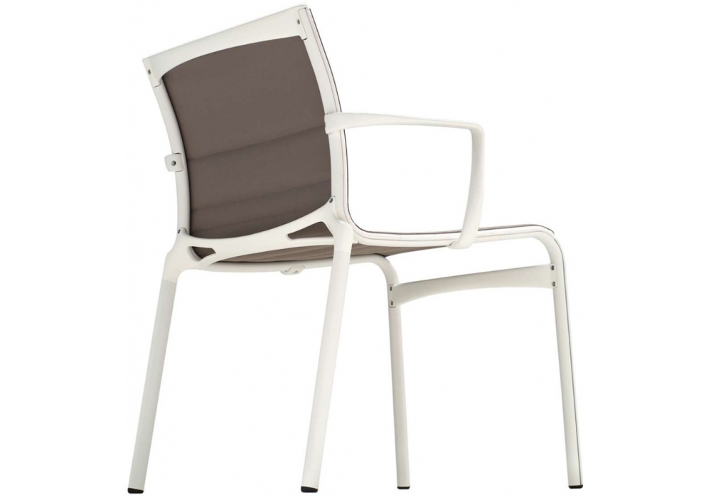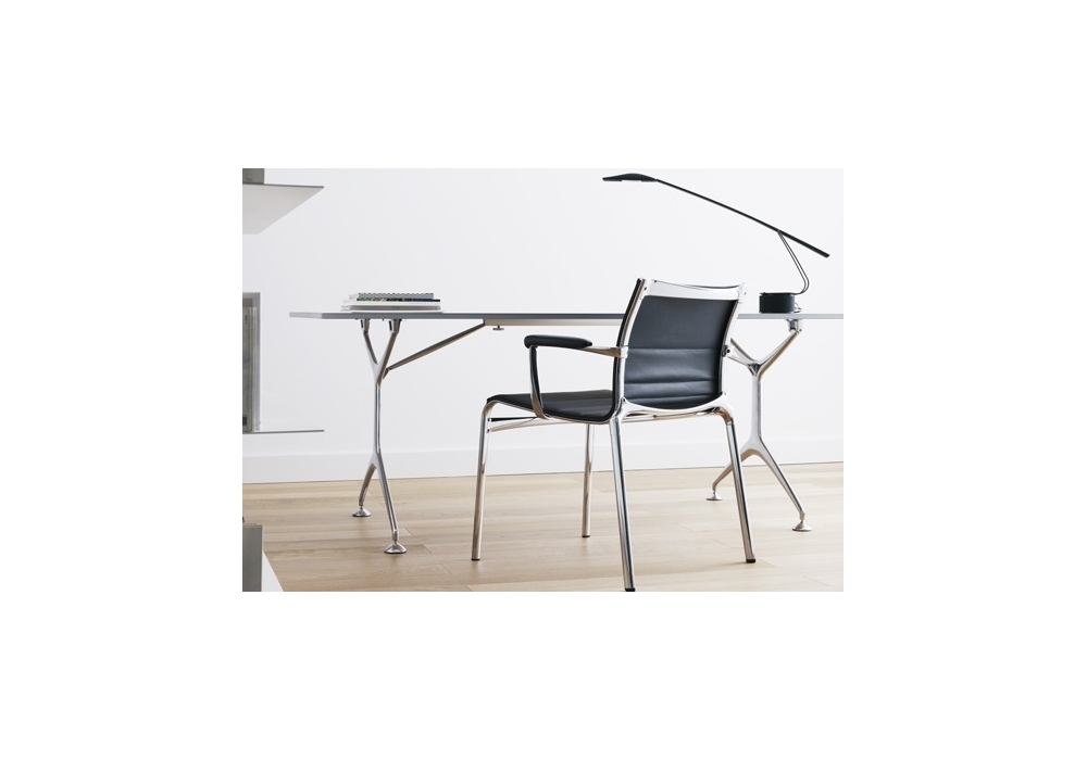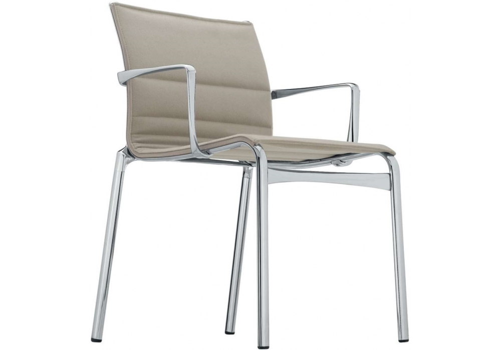 459 Frame 52 designed by Alberto Meda for Alias is a stackable chair with armrests made of extruded aluminum structure. Seat and backrest in fireproof net, Kvadrat® fabric, or Pelle Frau leather. Available in different finishes.