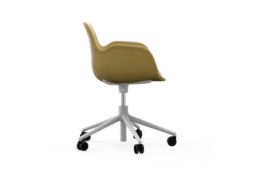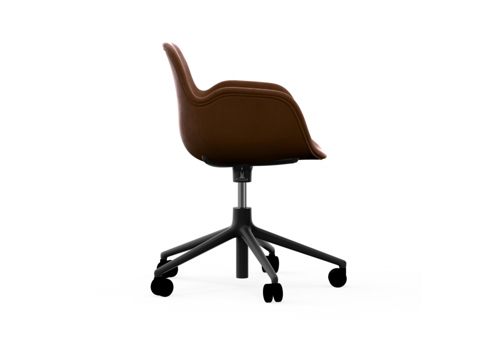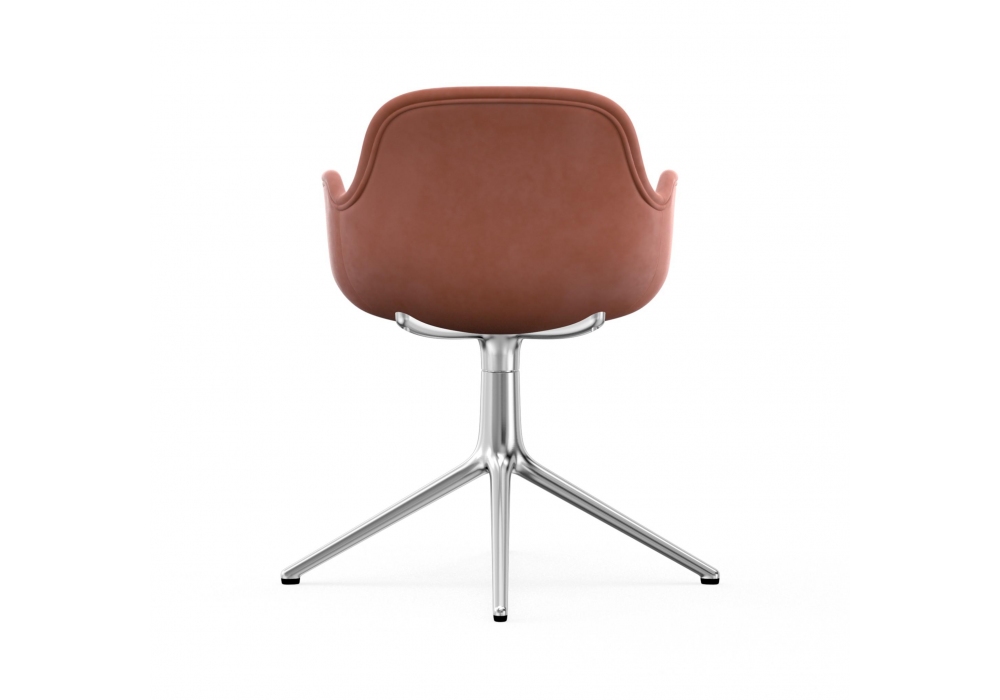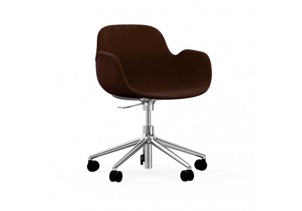 Form designed by Simon Legald for Normann Copenhagen is a swivel armchair with aluminium base and upholstery in fabric. The new swivel base in cool aluminium gives the Form armchair a masculine and exclusive look as well as comfortable freedom of movement, making the chair eminently suitable for places like conference rooms and restaurants. The swivel base grips the armchair shell with four slim arms that meet in a rotating centrepiece, which then branch out into either five or four legs, depending on whether the chair comes with castors. The swivel base with castors comes with a top quality gas pump and adds an aesthetic, yet functional, character to any office environment. Available in different finishes and two versions.