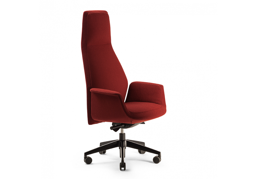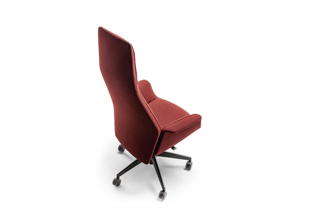 Downtown President designed by Jean Marie Massaud for Poltrona Frau is a swivel office chair with a moulded polyurethane foam structure with a metal insert and differentiated density padding with a polyester wadding quilt. The five-star base is available in polished or black-painted aluminum, with soft self-braking castors or glides. Upholstery is available in Pelle Frau® ColorSphere® leather (also available with micro-perforated parts upon request) or fabric. It features a 360° rotation, seat height adjustment, and a synchronized backrest tilt and oscillation mechanism with resistance adjustment. Tone-on-tone stitching is a visual highlight.