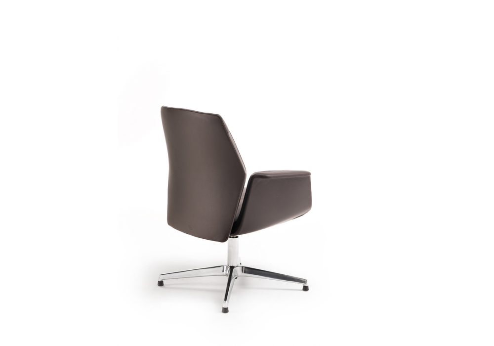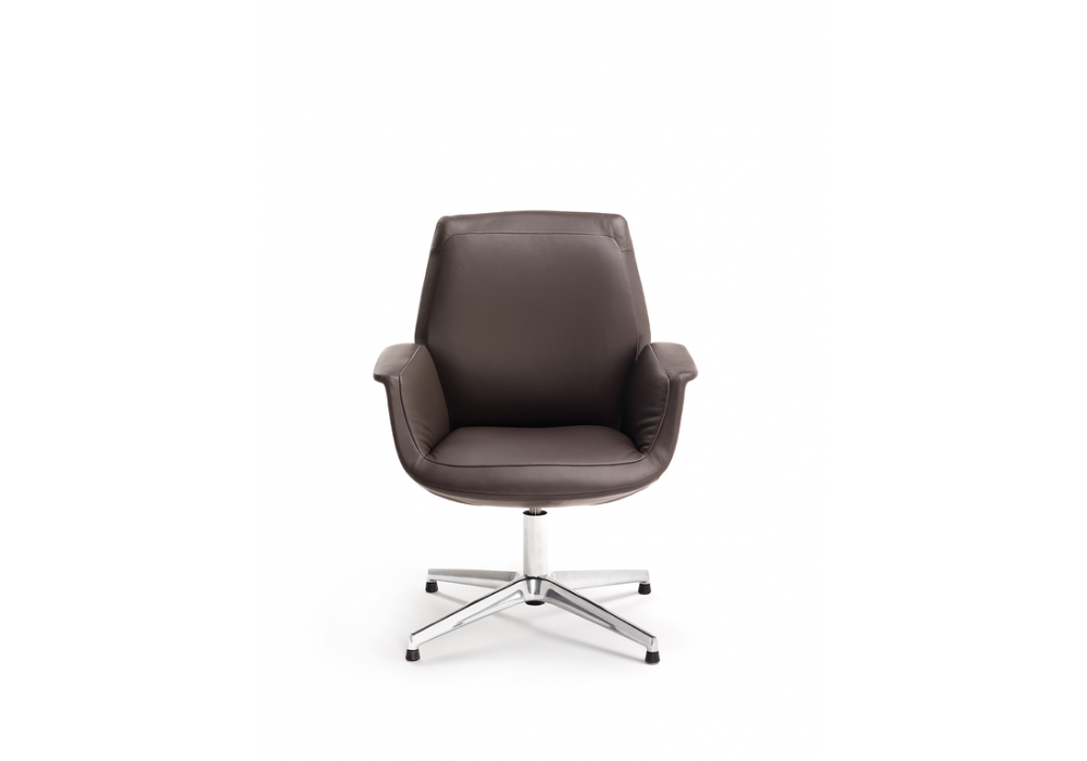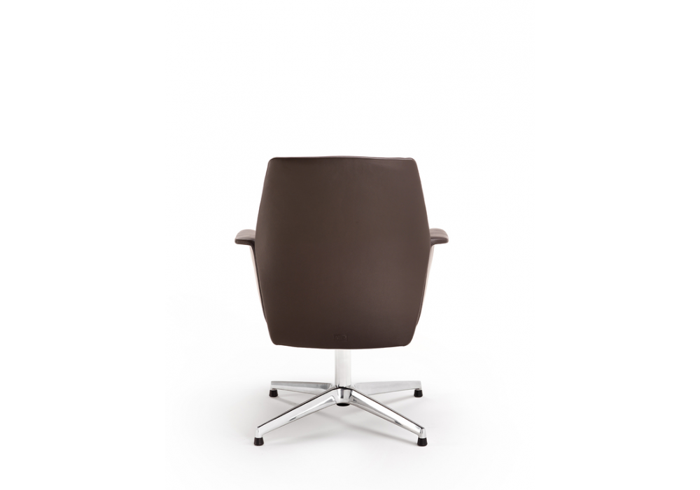 Downtown Visitor designed by Jean Marie Massaud for Poltrona Frau is a visitor chair with a molded polyurethane foam structure with a metal insert and variable-density padding with a polyester wadding quilt. It features a four-spoke base with swivel glides, available in polished or black-painted aluminum, with a rotation mechanism that automatically returns to the starting position. Upholstery in Pelle Frau® ColorSphere® leather (also with micro-perforated parts upon request) or fabric, with tone-on-tone stitching. The cover is not removable.
