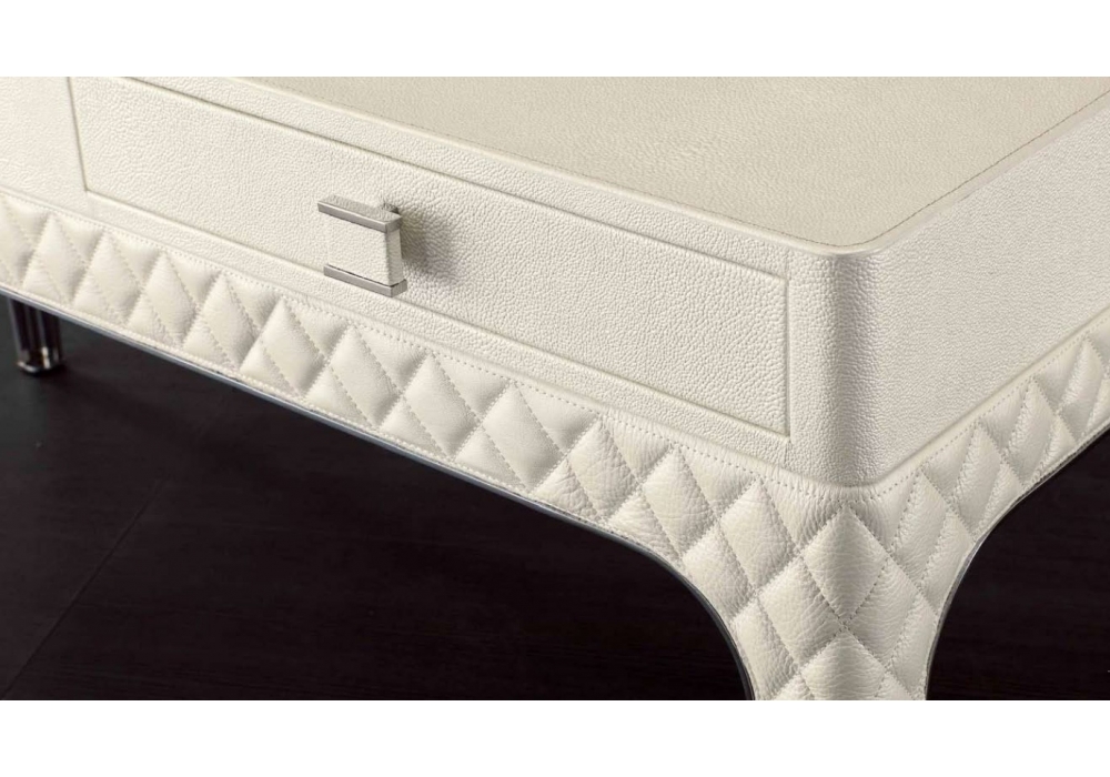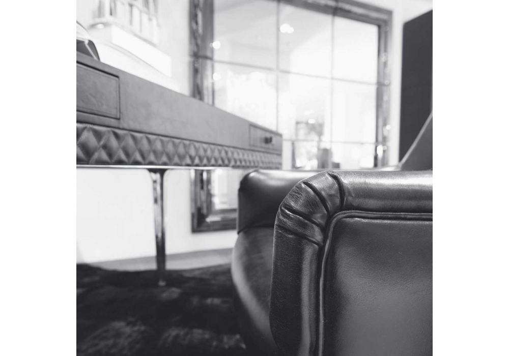 Coline designed by Rugiano is a desk covered in leather with two drawers. Details in steel or bronze. Available in various sizes.
