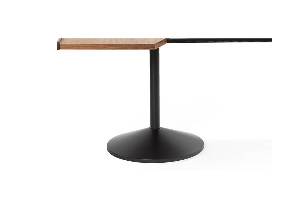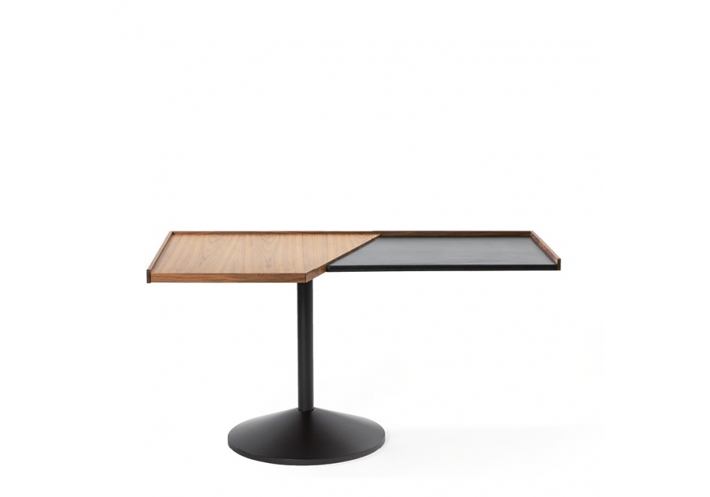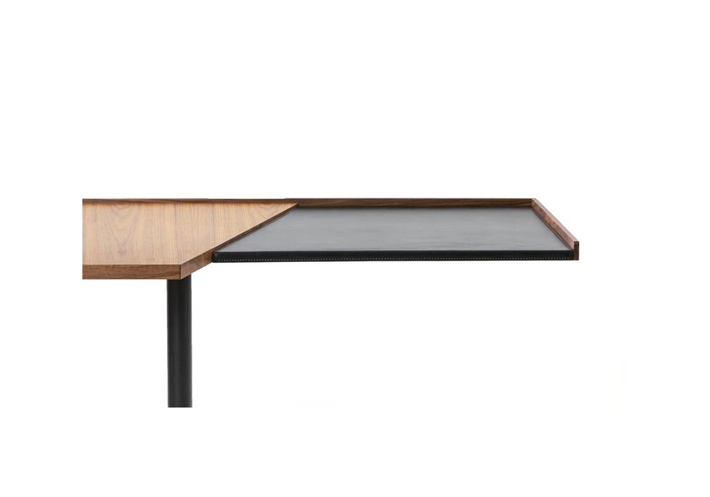 840 Stadera designed by Franco Albini for Cassina is a writing desk made with a tubular steel leg, two adjacent trapezoidal-shaped tops in natural Canaletto walnut and a leather accessory.