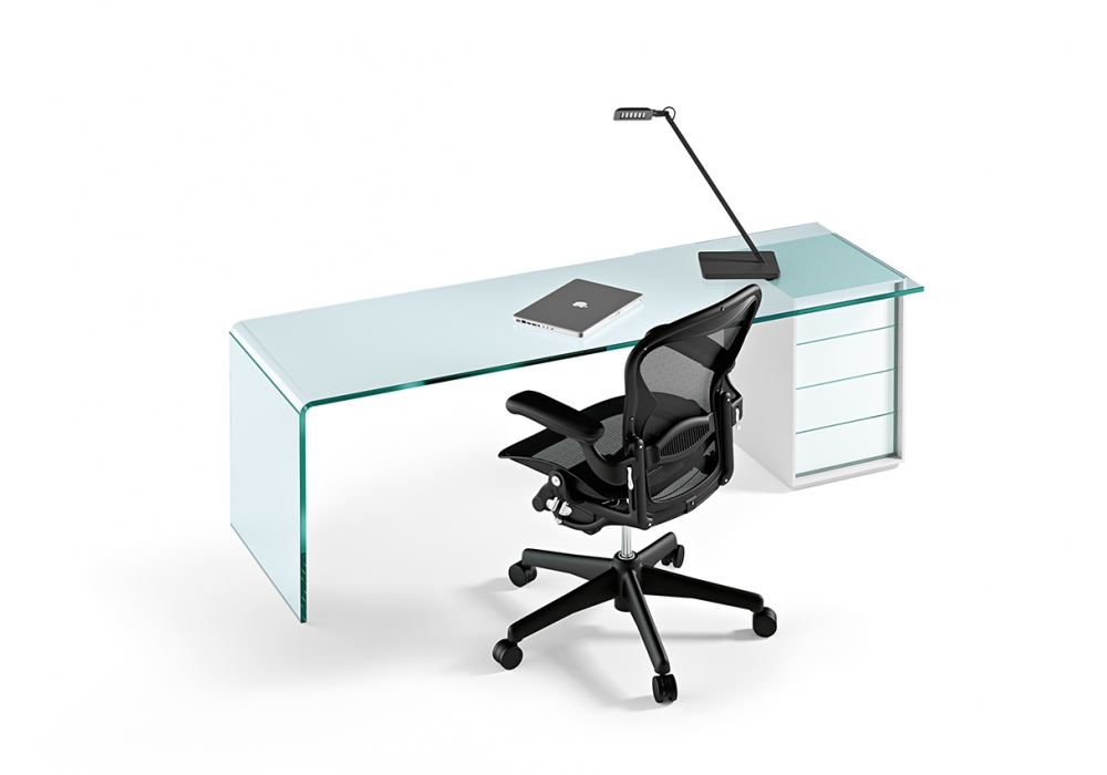 Rialto L designed by Design CRS Fiam is a desk in 15 mm curved glass combined with drawer unit in white or black matt lacquered wood, with fronts in glass varnished to match the structure colour.