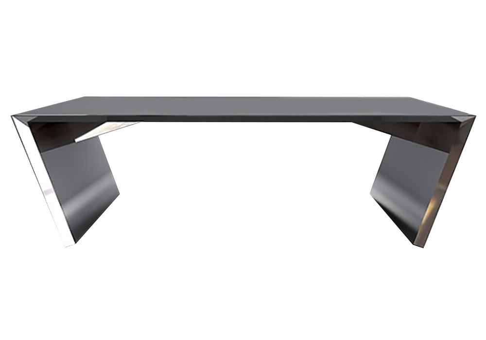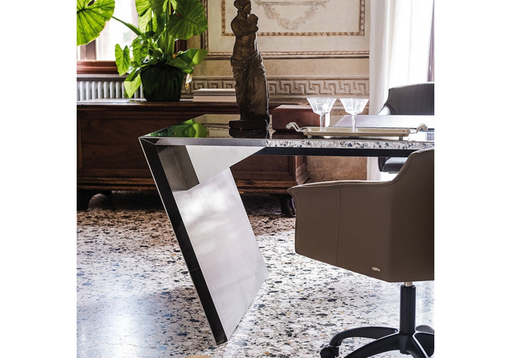 Vega designed by Giorgio Cattelan for Cattelan Italia is a desk with penisula, made of stainless steel or covered in Canaletto walnut or burned oak wood. Matt graphite painted desk interior. Silver or graphite painted chest of drawers with wheels. Drawers front and pad covered in saddle leather available in different finishes. Any small reflection irregularities in the steel version are due to manual processing. Available in two dimensions.