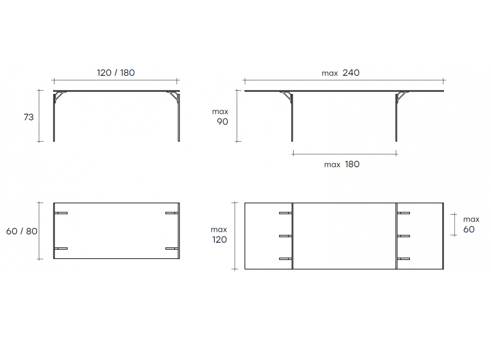 | Dimensions | 120 x 60 x H 73 cm; 130 x 60 x H 73 cm; 140 x 70 x H 73 cm; 160 x 70 x H 73 cm; 180 x 80 x H 73 cm. |