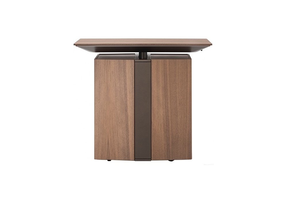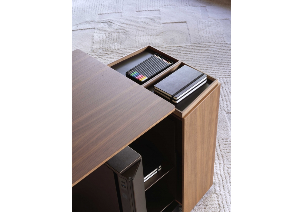 Touch Down Unit designed by Studio Klass for Molteni&C is a workstation made with a height-adjustable sliding top in canaletto walnut wood. Central body in painted metal, external shell in plastic material or covered in leather. Available in different finishes. We recommend the purchase of a power bank with USB-C output (Max dimensions of the power bank 7 x 2.5 x H 23 cm / 7.5 x 2 x H 23 cm)