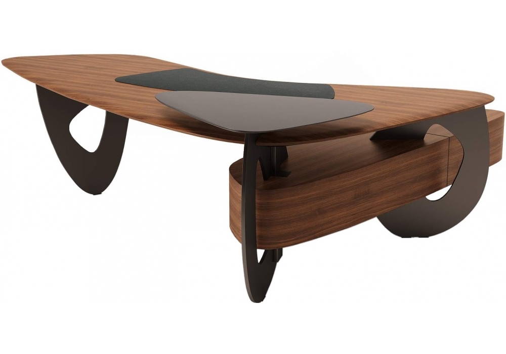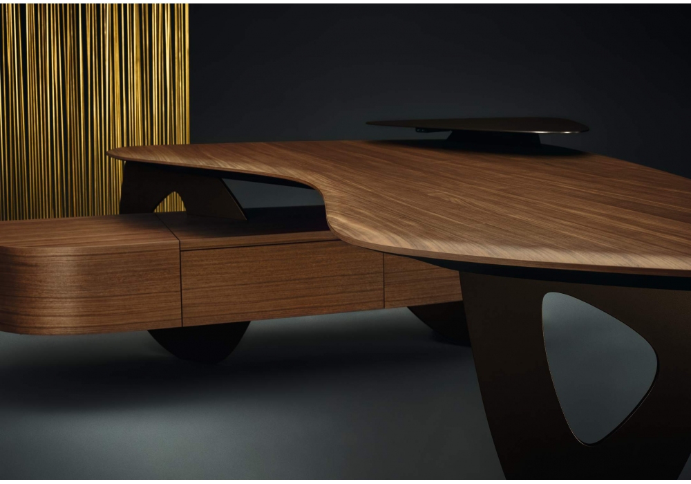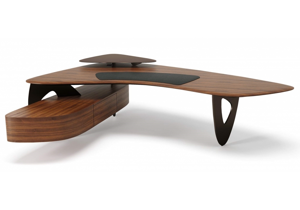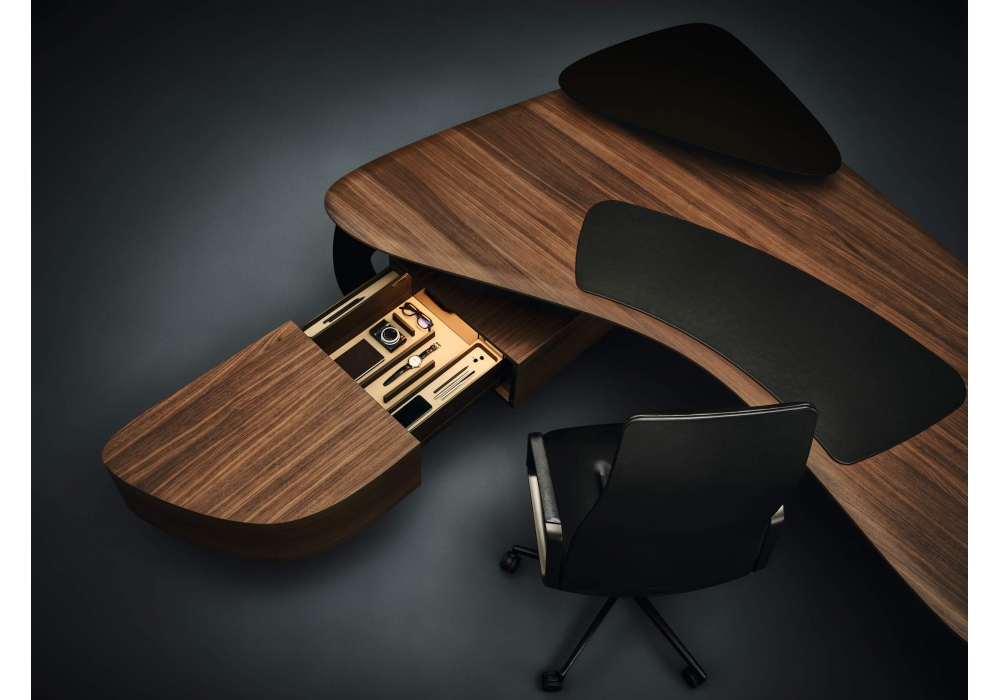 Tama designed by Eoos for Walter Knoll is a veneered wood office desk with top with rounded edge, lower top in fine-textured paint bronze and matt bronze powder-coated steel shelf. Panel legs in steel, powder-coated matt bronze. Desk pad in leather Congress.