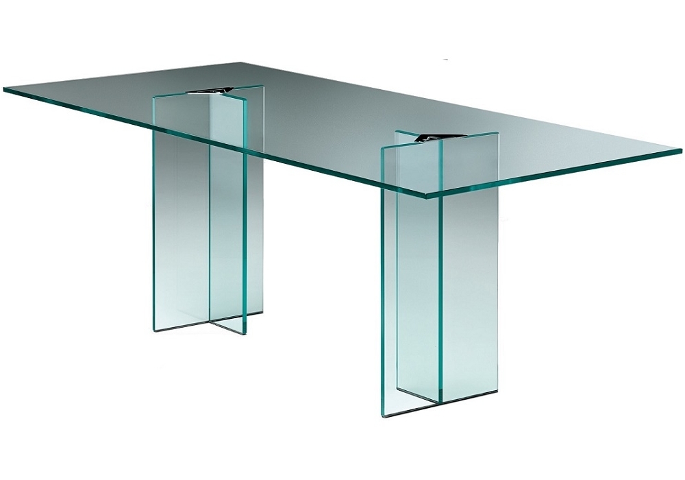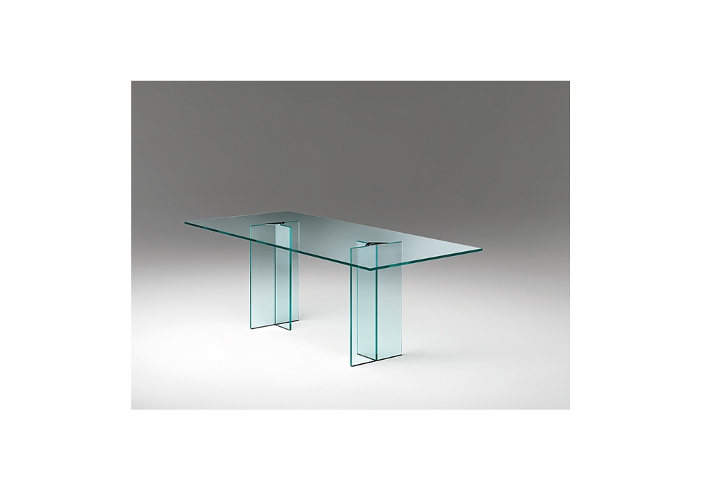 LLT Ofx Executive designed by Dante O. Benini & Luca Gonzo for Fiam is an executive desk made of transparent glass. The top is placed on glued glass bases and the holes present serve as cable glands.