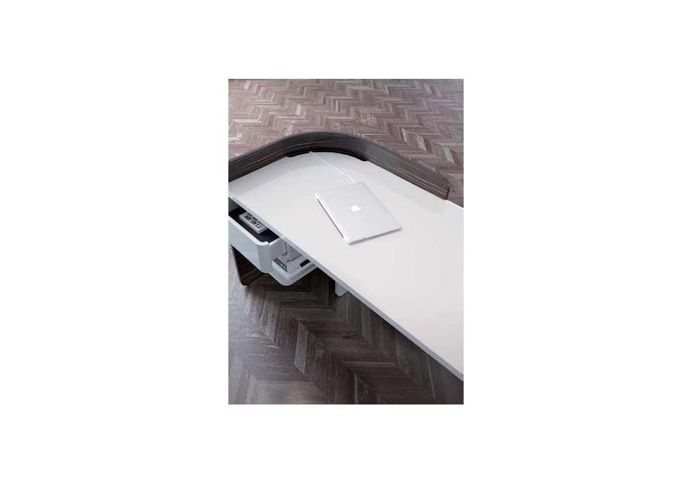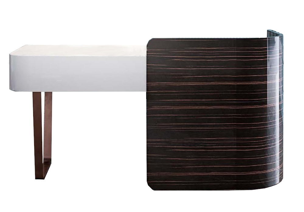 Cozy designed by Christophe de Sousa for Gual Design is a desk with matt lacquered mdf top with 2 drawers, gold or copper painted stainless steel foot and veneered wood structure.