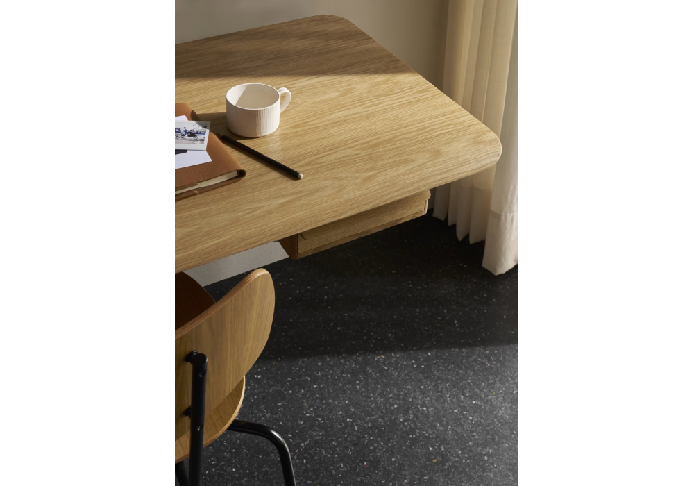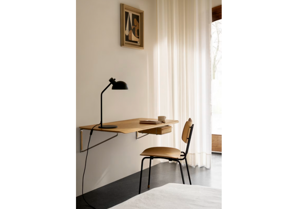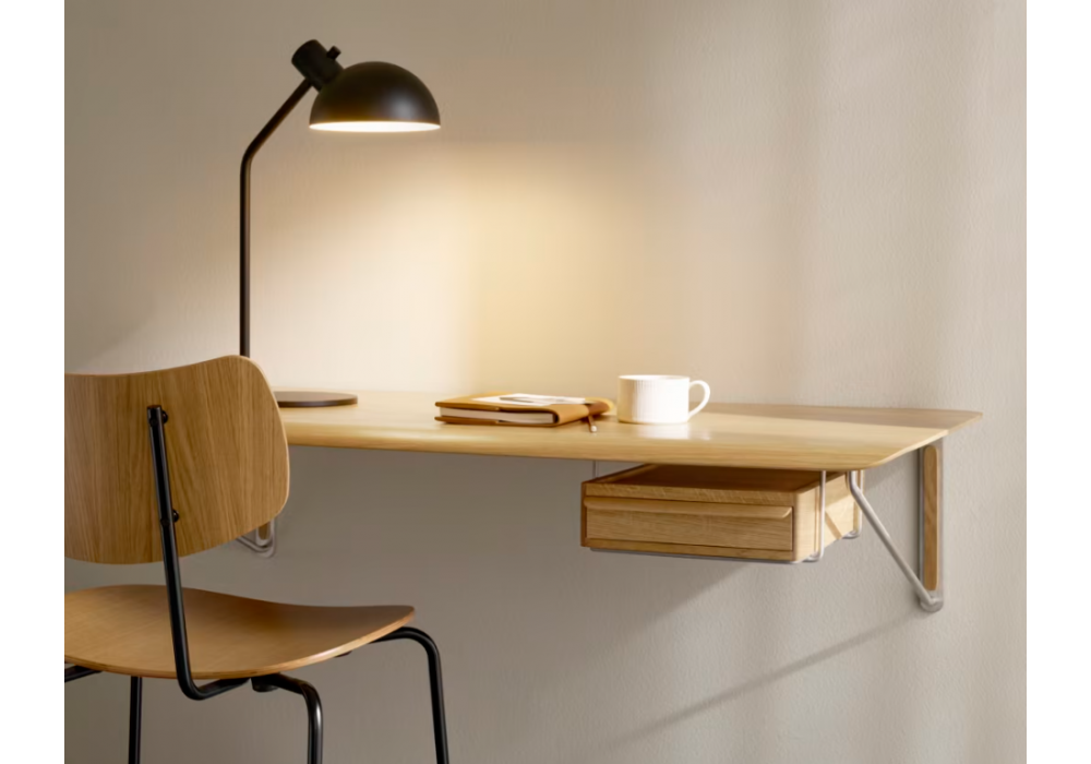 AB019 designed by Anker Bak for Carl Hansen & Søn is a wall desk with a veneered oak structure and a black or matching laminate top. Available with a solid wood drawer in the same finish as the wood of the structure; stainless steel supports.