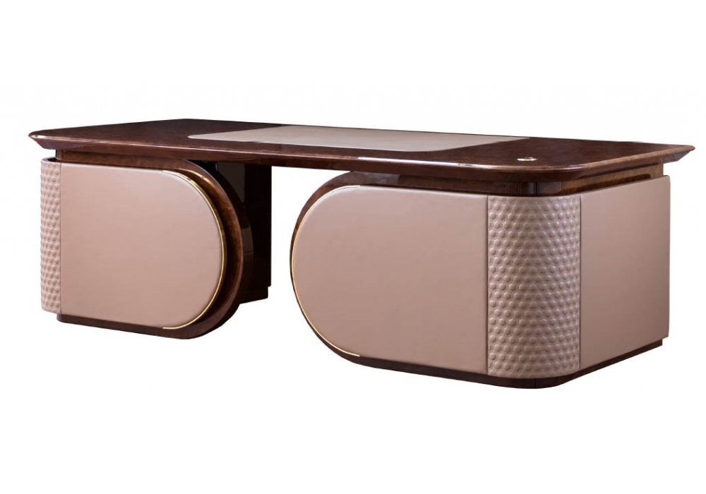 Vogue designed by Andrea Bonini for Turri is a desk with structure in MDF, plywood and particle board panels in glossy lacquered finish with embroidered leather upholstery. Available in the version with open or closed front. There is a cable gland on the top.