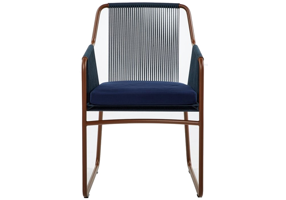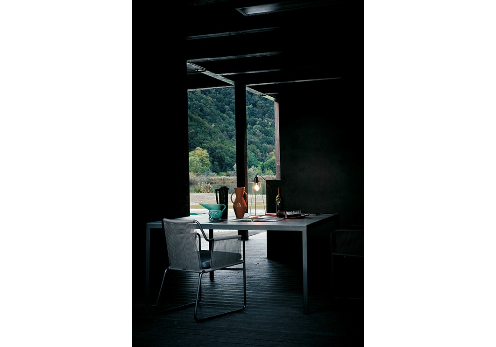 Harp 359 is an outdoor armchair with cushion designed by Rodolfo Dordoni for Roda. The classic string chair finds a new outdoor dimension, where polyester trails its infinite filaments around a tubular stainless steel structure in one continuous outline. Neutrality is ignited by seat cushions of different colors; lightness is given by air vibrating through the cords.