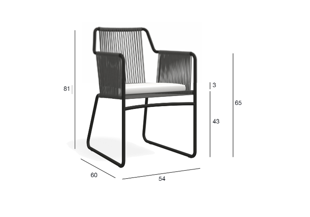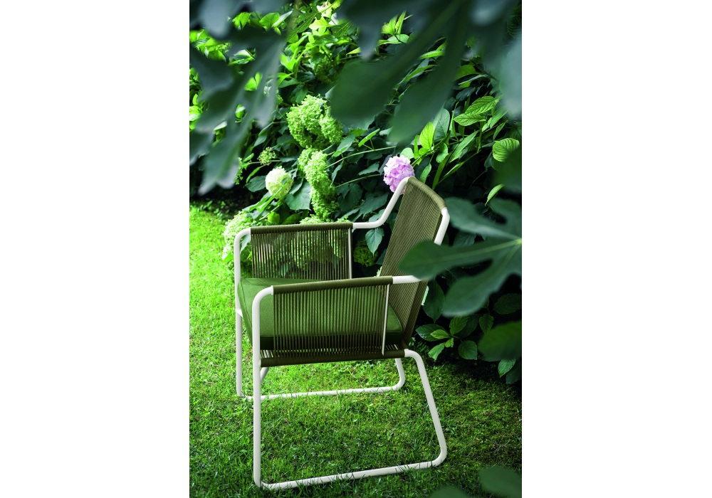 Harp 359 is an outdoor armchair with cushion designed by Rodolfo Dordoni for Roda. The classic string chair finds a new outdoor dimension, where polyester trails its infinite filaments around a tubular stainless steel structure in one continuous outline. Neutrality is ignited by seat cushions of different colors; lightness is given by air vibrating through the cords. Harp is a celebration of a craft manufacturing: a never-ending weave of cords that twine the stainless steel frame drawing lines that look continuous to the human eye. The structure, made in painted stainless steel welded by hand, and the cords, in a double polyester twisted thread with a cotton finishing, is available in milk/sand, smoke/grey, carob/tobacco, smokeolive, milkolive.