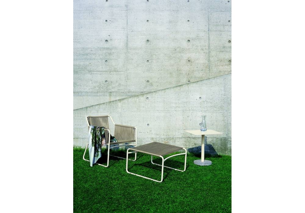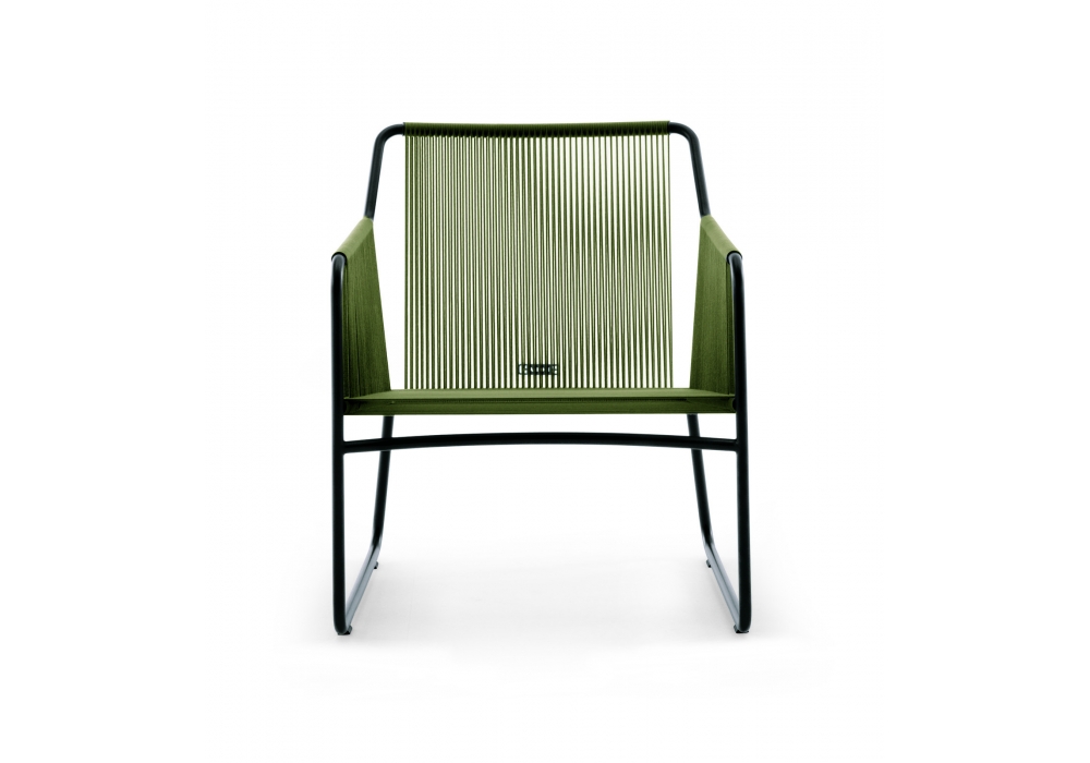 Harp 368 is an outdoor lounge chair designed by Rodolfo Dordoni for Roda. The classic string chair finds a new outdoor dimension, where polyester trails its infinite filaments around a tubular stainless steel structure in one continuous outline. Harp is a celebration of a craft manufacturing: a never-ending weave of cords that twine the stainless steel frame drawing lines that look continuous to the human eye. The structure, made in painted stainless steel welded by hand, and the cords, in a double polyester twisted thread with a cotton finishing, is available in milk/sand, smoke/grey, carob/tobacco, smokeolive, milkolive.
