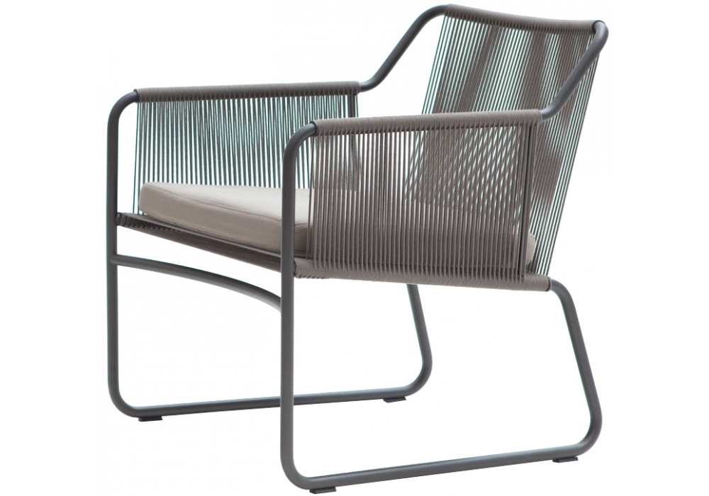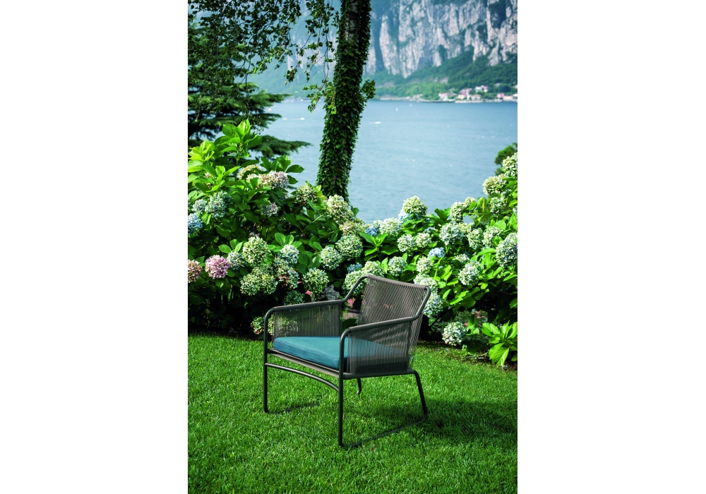 Harp 368 is an outdoor lounge chair with cushion designed by Rodolfo Dordoni for Roda. The classic string chair finds a new outdoor dimension, where polyester trails its infinite filaments around a tubular stainless steel structure in one continuous outline. Neutrality is ignited by seat cushions of different colors; lightness is given by air vibrating through the cords. Harp is a celebration of a craft manufacturing: a never-ending weave of cords that twine the stainless steel frame drawing lines that look continuous to the human eye. The structure, made in painted stainless steel welded by hand, and the cords, in a double polyester twisted thread with a cotton finishing, is available in milk/sand, smoke/grey, carob/tobacco, smokeolive, milkolive.