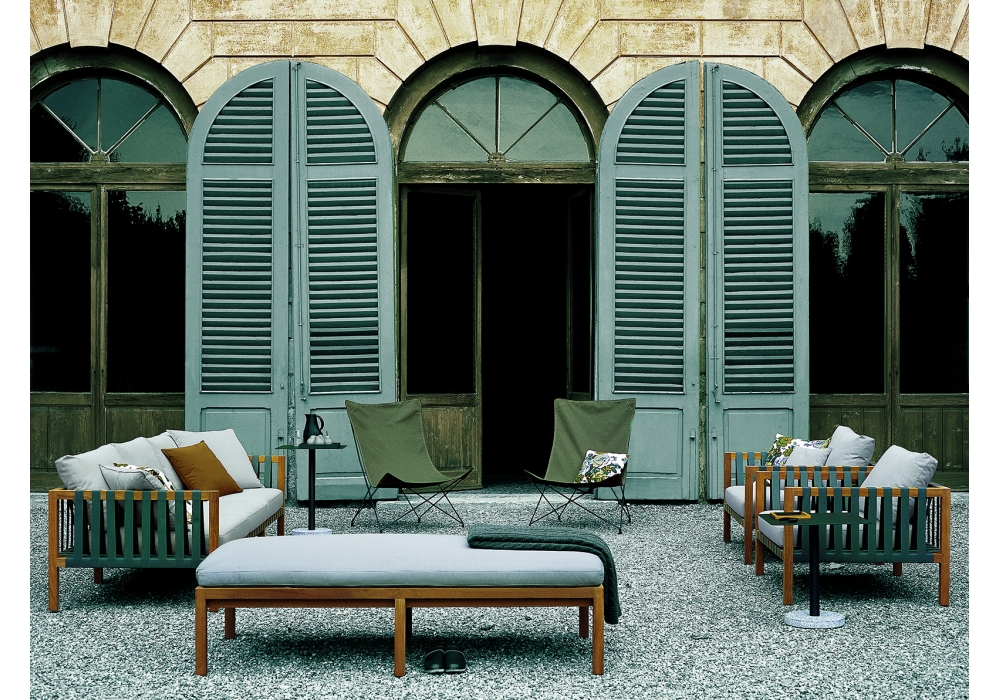 Mistral 101 designed by Rodolfo Dordoni for Roda is an armchair with teak structure and cushions in fabric. The structure in solid teak is available with grey, tobacco or olive coloured belts.