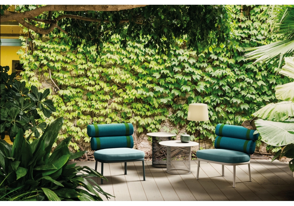 Roll designed by Patricia Urquiola for Kettal is a club chair with a painted aluminum structure. The seat and backrest cushions are padded and covered in fabric, with the backrest anchored by fabric straps. Roll is available in different frame and upholstery finishes.
