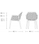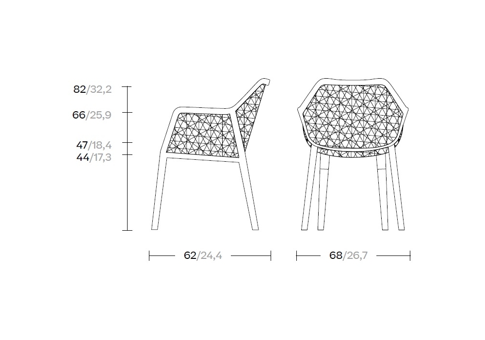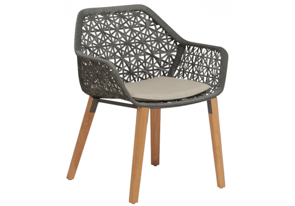 Maia designed by Patricia Urquiola for Kettal is an outdoor dining chair with an aluminum frame and teak wood legs. The shell is in aluminum covered in woven fiber or rope. The cushions are padded and covered in fabric. Maia is available in different finishes.