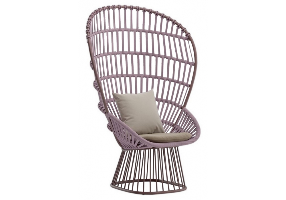 Cala designed by Doshi Levien for Kettal is a high-backed armchair with a painted aluminum body and base or with a teak wood base. The body is covered in synthetic rope while the cushions are padded and covered in fabric suitable for outdoor use. Cala is available in different finishes.