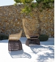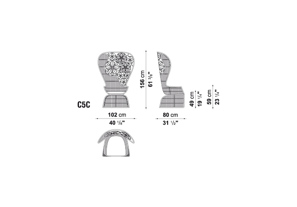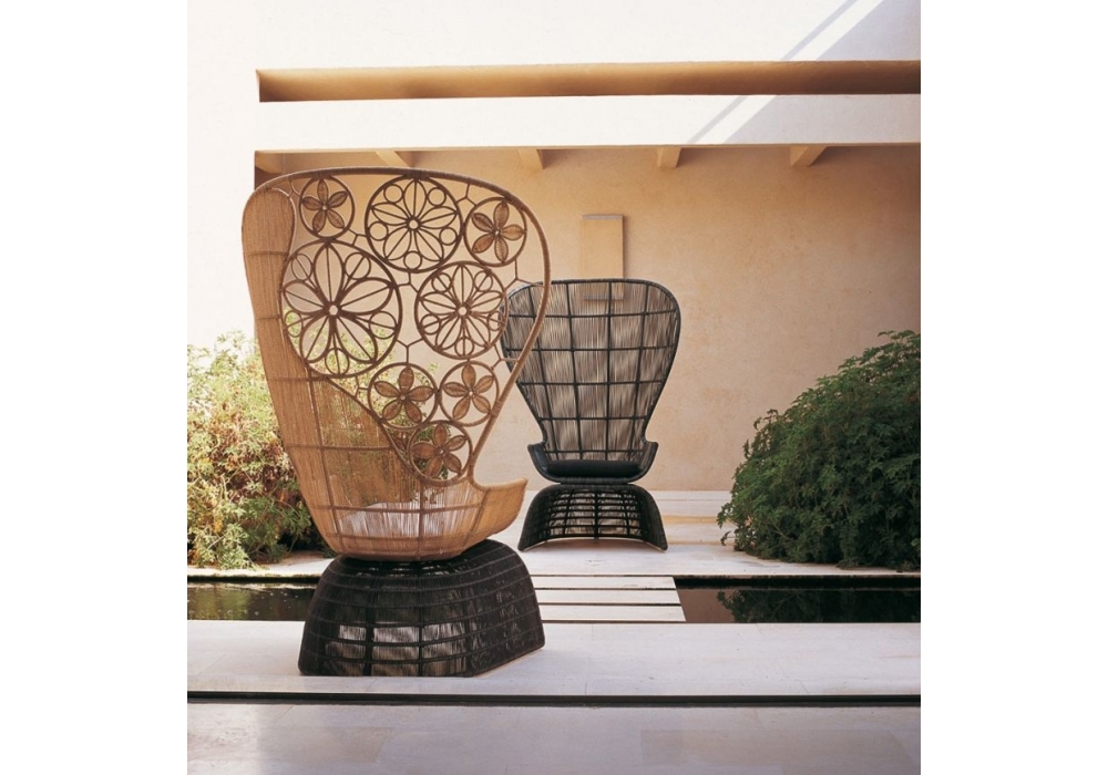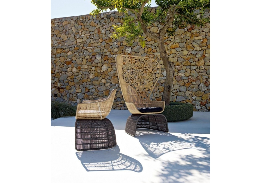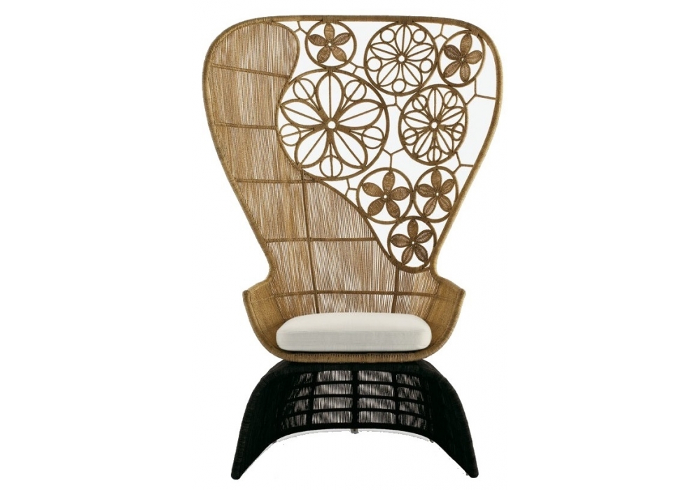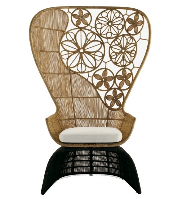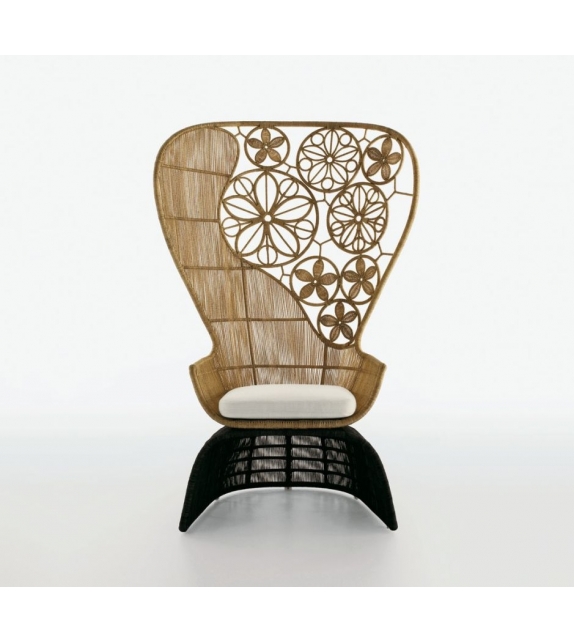 Crinoline C5C designed by Patricia Urquiola for B&B Italia Outdoor is an armchair with structure in polyester powder painted aluminium. Base with interlacing in grey abaca. Seat with interlacing in natural abaca. Ferrules in thermoplastic material. Seat cushion with covering in fabric.
