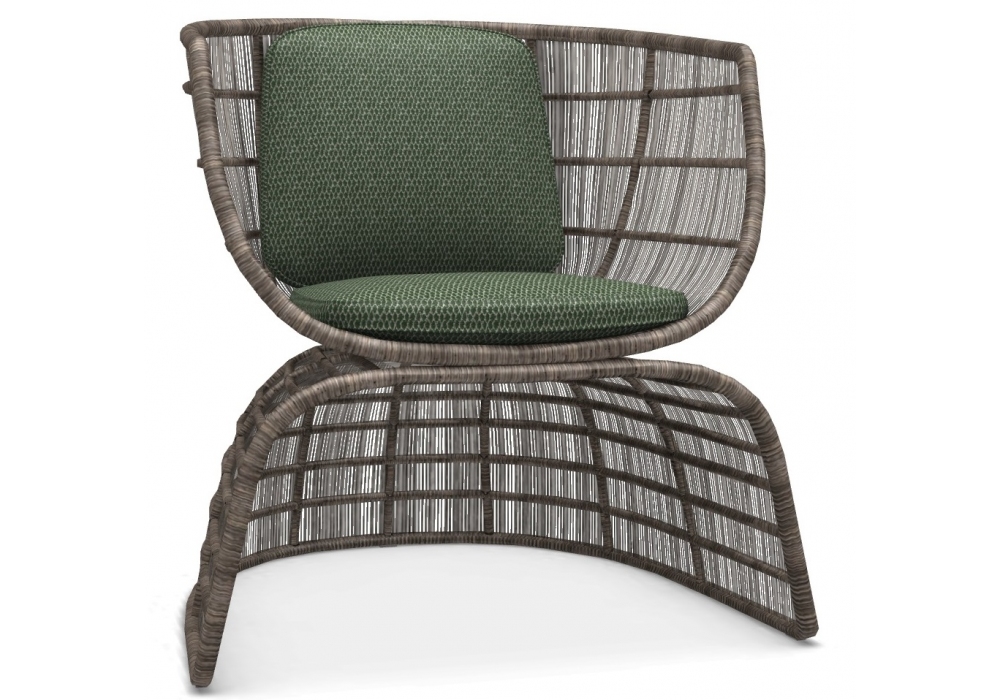 Crinoline designed by Patricia Urquiola for B&B Italia Outdoor is a small armchair with structure in polyester powder painted aluminium tortora. Interlacing in tortora polyethylene. Ferrules in thermoplastic material. Seat and back cushion with covering in fabric.