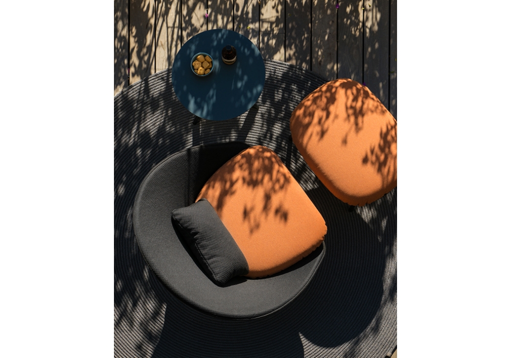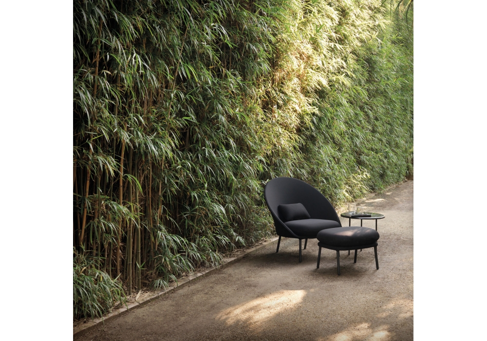 Twins designed by Mut Design for Expormim is a low armchair made of high-strength aluminum tubes and fabric upholstery suitable for outdoor use. Available in different finishes.