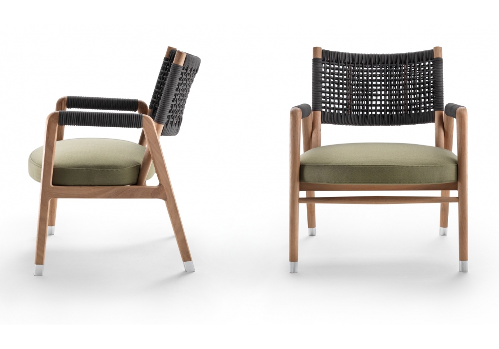 Ortigia Outdoor designed by Flexform is an armchair from the Outdoor collection. Backrest and inserts on the armrests made with interwoven polypropylene. Iroko solid wood structure in natural finish, gray stained and white lacquered. Seat cushion upholstered in polyurethane foam and water repellent fabric covering.