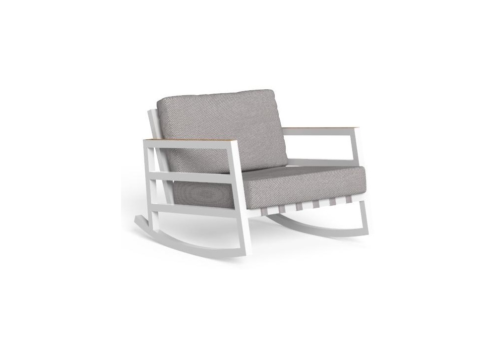 Alabama Alu is a Rocking Chair designed by Marco Acerbis for Talenti. Powder-coated aluminum structure. Seat and backrest have a support of synthetic elastic straps, with teak strip on the upper side. The cushions are made of fabric, removable, easy to wash and resistant to atmospheric agents.