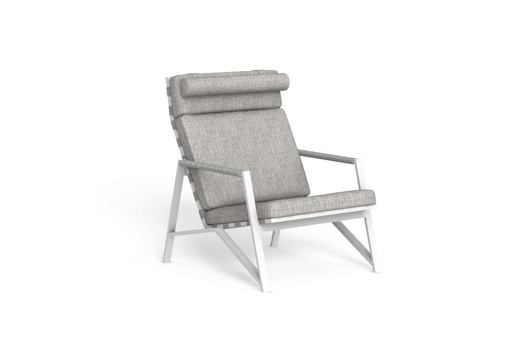 Cottage is a High armchair designed by Ramón Esteve for Talenti. Powder-coated aluminum structure available in different variants. The seat and back are supported by synthetic elastic straps, coordinated with the color of the armrest cord. Removable cushions, easy to wash and weather resistant.