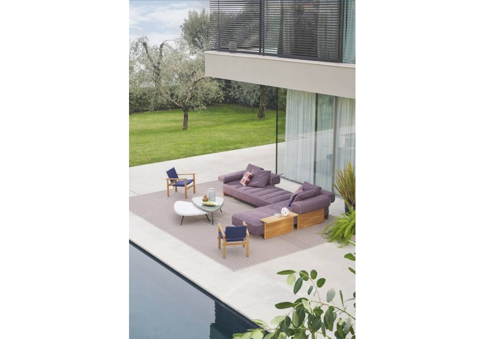 Doron Hotel Outdoor designed by Charlotte Perriand for Cassina is an armchair with structure made of solid teak wood, natural finish. Seat padding in polyurethane foam with waterrepellent fabric upholstery.