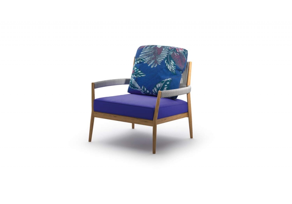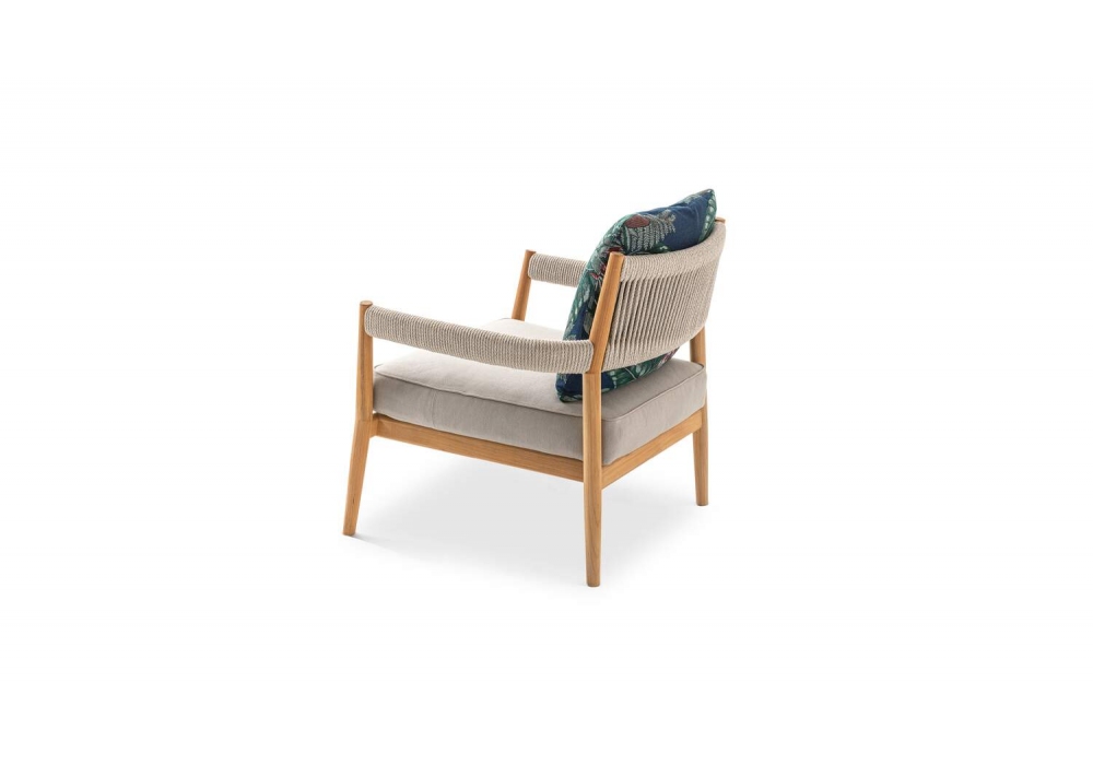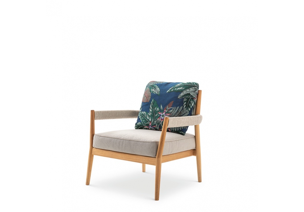 Dine Out designed by Rodolfo Dordoni for Cassina is an outdoor armchair made with armrests and backrest strung in Orbettino rope and structure in solid natural teak wood. Fabric upholstery in different finishes. Seat cushion with contrasting gray grosgrain profile.