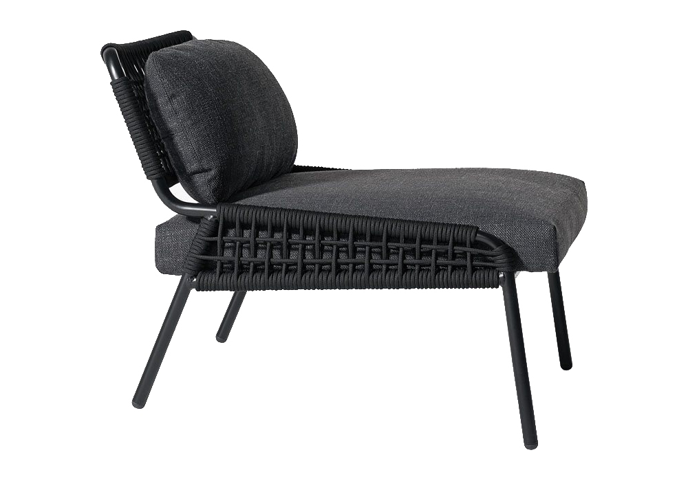 Zoe designed by Andrea Parisio for Meridiani is an armchair with frame in varnished aluminum and seat cushion in polyurethane and polyester fiber with water-repellent cover. The finishes for backrest and side is available in polypropylene rope is woven available in 4 finishes. Available back cushion or lumbar cushion.