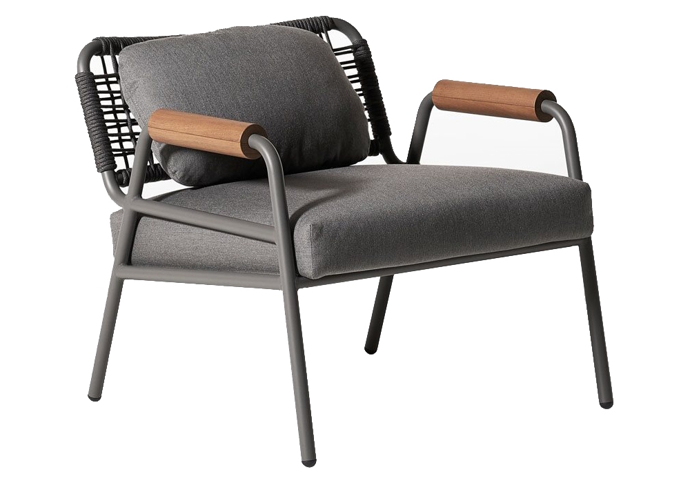 Zoe Wood designed by Andrea Parisio for Meridiani is a small armchair with frame in varnished aluminum and seat cushion in polyurethane and polyester fiber with water-repellent cover. The finishes for backrest and side is available in polypropylene rope is woven available in 4 finishes. The armrests are finishing with details in solid iroko wood. Available back cushion or lumbar cushion.