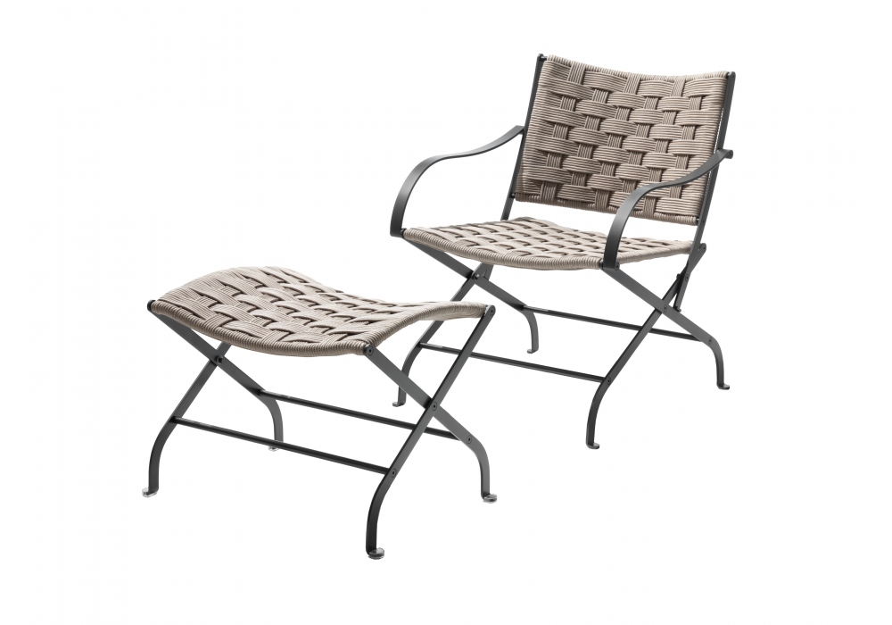 Carlotta designed by Antonio Citterio for Flexform is a small armchair belonging to the Outdoor collection. Structure in painted stainless steel. Seat and backrest in stainless steel with polypropylene cord weaving in various colours. A matching pouf is also available on request.