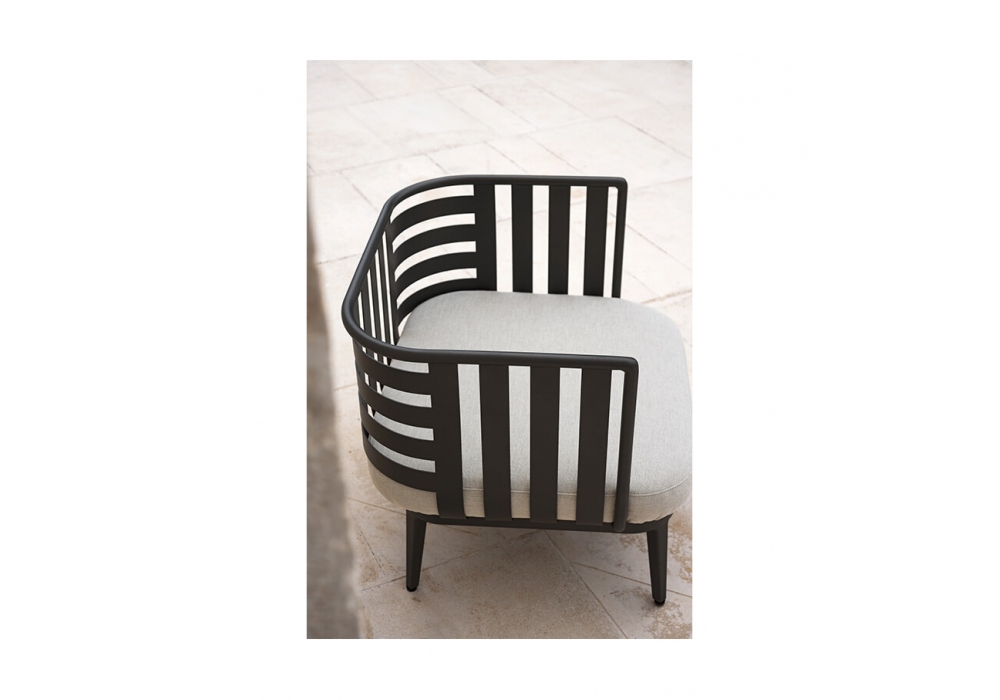 Thea designed by Adam D. Tihany for Roda is an outdoor armchair with structure in powder-coated aluminum. It is available in different upholstery fabrics.