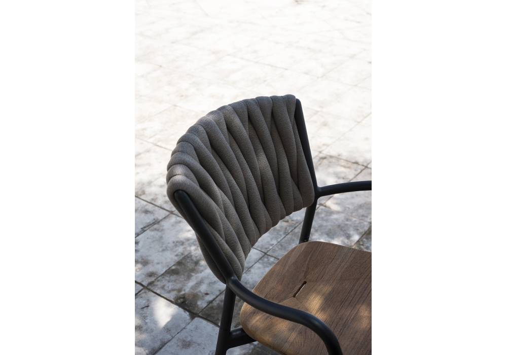 Piper 221 designed by Rodolfo Dordoni for Roda is an outdoor small armchair made of powder-coated aluminum tubing. Back upholstered with padded belt and seat in teak or polyurethane resin.