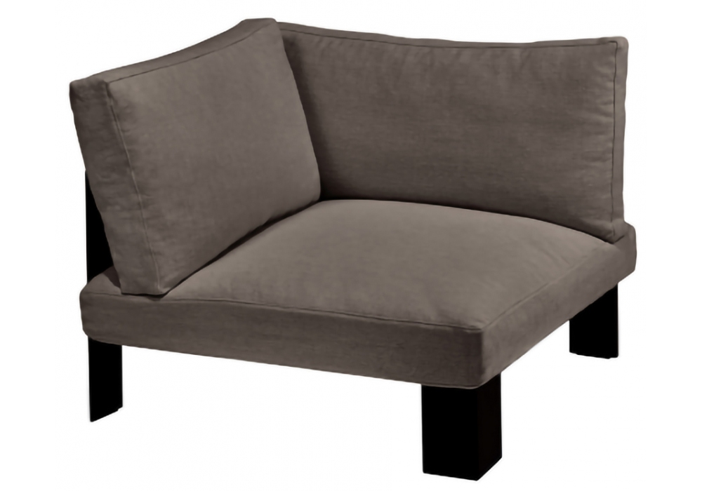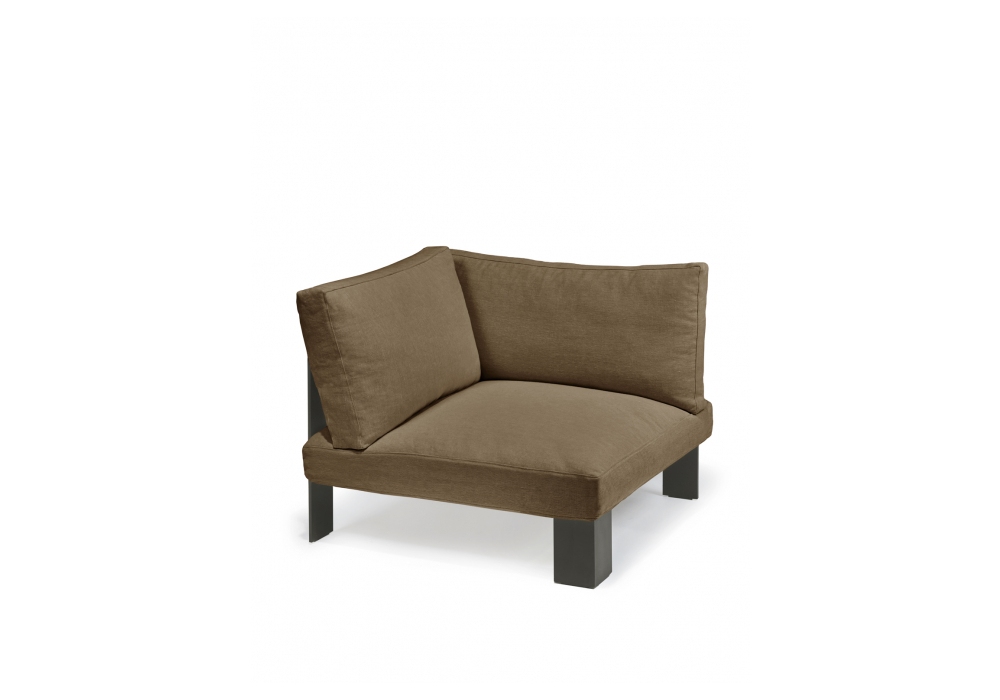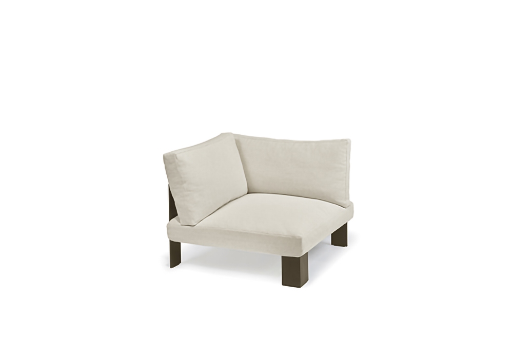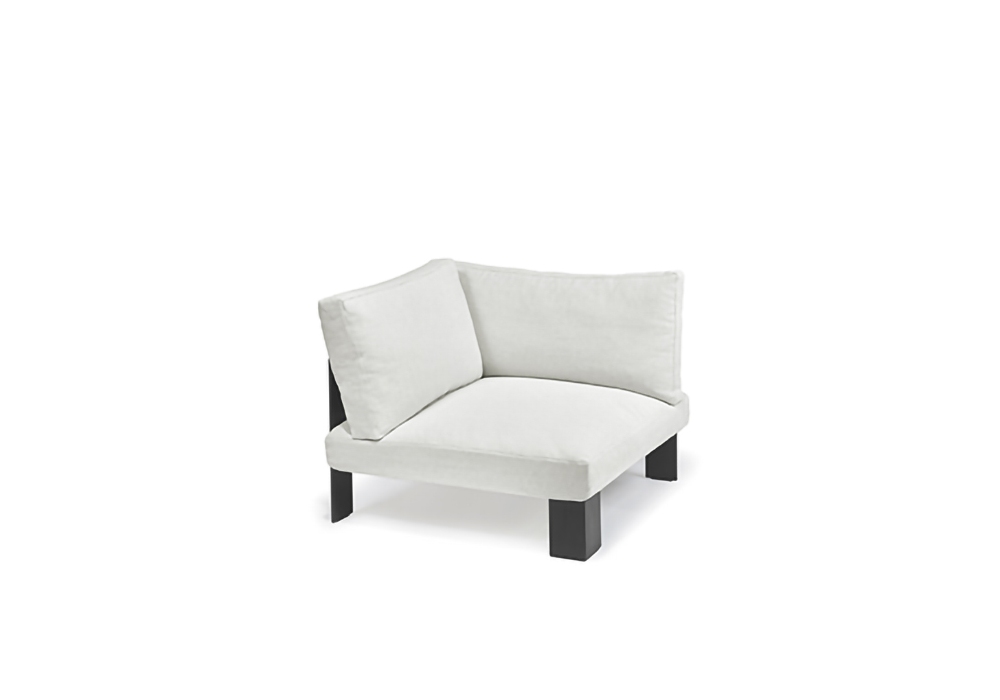 Bench Corner designed by Bea Mombaers for Serax is an outdoor corner armchair, with supporting structure made up of small squares in black painted aluminum. The upholstery is available in different finishes.